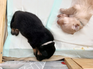 Heute, mit gut drei Wochen, der erste Ausflug ins Welpenzimmer.